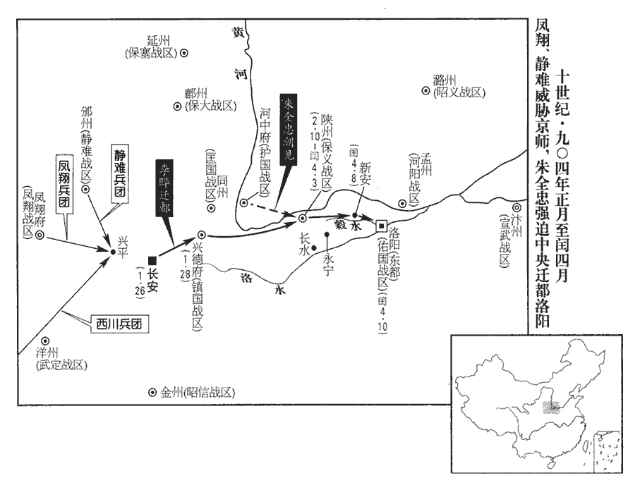 〖译文〗 [45]凤翔节度使李茂贞、州静难节度使李继徽屡次出兵逼近京畿,朱全忠怀疑他们又有劫持昭宗迁往凤翔的图谋,于十一月派遣骑兵驻扎河中。