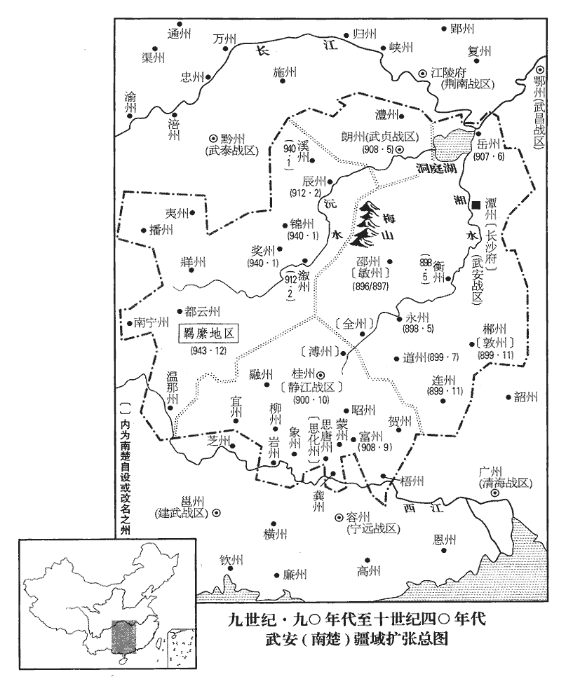 4荊南‹总部设江陵府湖北省江陵县›節度使高季昌遣兵屯漢口‹汉水注入长江处·湖北省武汉市汉水北岸›,漢口,漢水入江之口,其地在鄂州漢陽縣東大別山下。絕楚朝貢之路;楚王殷遣其將許德勳將水軍擊之,至沙頭‹湖北省荆州市›,沙頭即今江陵城南沙頭市。季昌懼而請和。殷又遣步軍都指揮使呂師周將兵擊嶺南‹南岭以南›,呂師周降馬殷,見上卷元年。與清海‹总部设广州广东省广州市›節度使劉隱十餘戰,取昭‹广西平乐县›、賀‹广西贺州市›、梧‹广西梧州市›、蒙‹广西蒙山县›、龔‹广西平南县›、富‹广西昭平县›六州。蒙州,隋始安郡之隋化縣,唐武德四年置南恭州,貞觀二年更名蒙州。龔州,本漢猛陵縣地,隋為永平郡武林縣,唐貞觀三年置鷰州,七年移鷰州於今州東,仍於鷰州舊所置龔州。又武德四年以始安郡之龍平、豪靜及蒼梧郡之蒼梧置富州。九域志,昭州東至賀州三百二十五里,南至梧州四百九十里,南稍斜至龔州五百五十里。宋開寶廢富州,以龍平縣隸昭州,在州東南百六十二里。熙寧五年廢蒙州,以立山縣隸昭州,在州南二百十二里。殷土宇既廣,乃養士息民,湖南遂安。