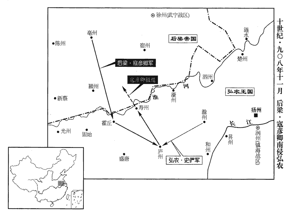 11帝從吳越王鏐之請,以亳州‹安徽省亳州市›團練使寇彥卿為東南面行營都指揮使,擊淮南。十一月,彥卿帥眾二千襲霍丘‹安徽省霍邱县›,帥,讀曰率。為土豪朱景所敗;敗,補邁翻;下同。又攻廬‹安徽省合肥市›、壽‹安徽省寿县›二州,皆不勝。淮南遣滁州‹安徽省滁州市›刺史史儼拒之,彥卿引歸。寇彥卿兵勢已挫,而史儼河東健將,汴兵所畏也,故聞其至而退。