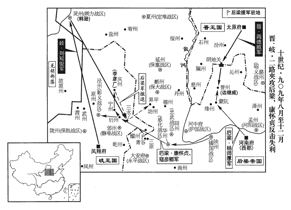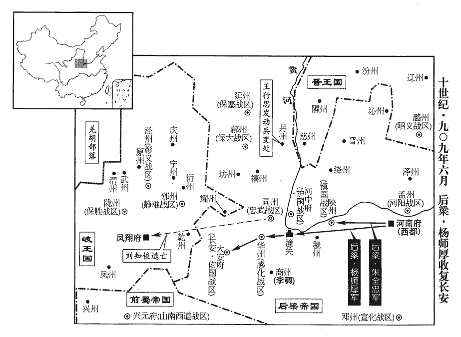 20忠武‹总部设同州陕西省大荔县›節度使兼侍中劉知俊,去年更同州匡國軍為忠武軍,事見上卷。功名浸盛,以帝猜忍日甚,內不自安;及王重師誅,知俊益懼。帝將伐河東‹首都太原府›,河東,謂晉。急徵知俊入朝,欲以為河東西面行營都統;且以知俊有丹、延之功,厚賜之。知俊弟右保勝指揮使知浣從帝在洛陽,密使人語知俊云:語,牛倨翻。「入必死。」又白帝,請帥弟姪往迎知俊,帥,讀曰率。帝許之。六月,乙未朔‹一›,知俊奏「為軍民所留」,遂以同州附於岐。考異曰:實錄:「六月庚戌,知俊據本郡反,削奪官爵,興師討伐。」編遺錄:「六月,乙未,初奏本道軍民遮留,尋聞擒使臣及將送鳳翔。」蓋編遺據奏到之日,實錄據削奪之日也。執監軍及將佐之不從者,皆械送於岐。遣兵襲華州‹陕西省华县›,逐刺史蔡敬思,九域志:同州南至華州七十里。華,戶化翻。以兵守潼關‹陕西省潼关县›。潛遣人以重利啗長安諸將,啗,徒濫翻。執劉捍,送於岐,殺之。知俊遣使請兵於岐,亦遣使請晉人出兵攻晉‹山西省临汾市›、絳,遺晉王‹李存勖,本年二十五岁›書曰:「不過旬日,可取兩京,復唐社稷。」遺,唯季翻。長安可以言取;梁都洛陽未易取也。