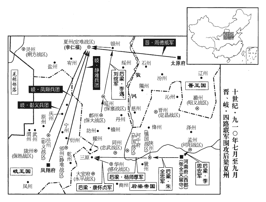 20岐王與邠、涇二帥邠帥,李繼徽‹静难总部设邠州陕西省彬县›;涇帥,劉知俊‹彰义总部设泾州甘肃省泾川县›。帥,所類翻。各遣使告晉,請合兵攻定難節度使李仁福;難,乃旦翻。晉王遣振武‹总部设朔州山西省朔州市›節度使周德威將兵會之,合五萬眾圍夏州,仁福嬰城拒守。夏,戶雅翻。