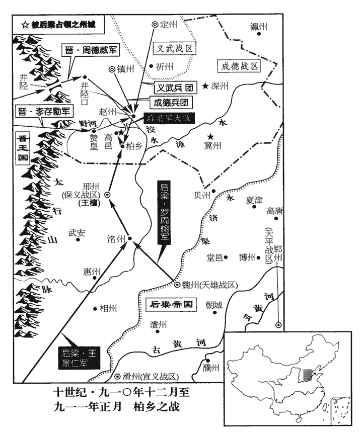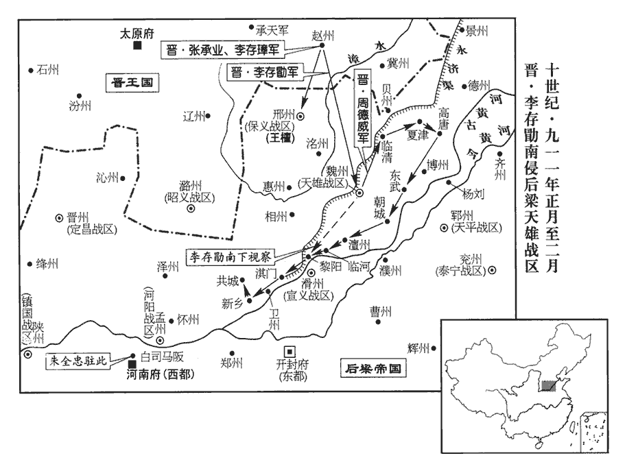 司天言:「來月太陰虧,不利宿兵於外。」上召王景仁等還洛陽。十二月,己未‹三›,上聞趙與晉合,晉兵已屯趙州,乃命王景仁等將兵擊之。庚申‹四›,景仁等自河陽渡河,會羅周翰‹天雄总部魏州›兵,合四萬,軍于邢‹河北省邢台市›、洺‹河北省永年县东南旧永年镇›。