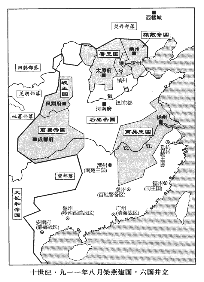 4晉周德威拔燕‹首都幽州›安遠軍‹天津市蓟县西北›,薊州‹天津市蓟县›將成行言等降于晉。將,即亮翻。宋白曰:薊州治漁陽,本春秋無終子之國,隋開皇初徙玄州於此,煬帝廢州,立漁陽郡。唐初廢郡,其地屬幽州;開元十八年置薊州,取古薊門關以名。州西至幽州二百一十里。