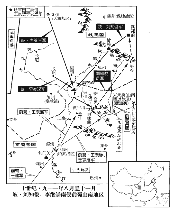 16岐王使劉知俊、李繼崇將兵擊蜀,乙亥‹二十四›,王宗侃、王宗賀、唐道襲、王宗紹與之戰於青泥嶺‹陕西省略阳县西北›,青泥嶺在興州長舉縣西北五十里,懸崖萬仞,上多雲雨,行者多逢泥淖。蜀兵大敗,馬步使王宗浩奔興州‹陕西省略阳县›,溺死於江,此江,嘉陵江也。道襲奔興元‹陕西省汉中市›。先是,步軍都指揮使王宗綰城西縣‹陕西省勉县›,號安遠軍‹陕西省勉县›,九域志:西縣在興元府西一百里。宗侃、宗賀等收散兵走保之,知俊、繼崇追圍之。眾議欲棄興元,道襲曰:「無興元則無安遠,利州遂為敵境矣。九域志:興元西至西縣百里,西縣抵利州界四十五里,自界首至利州二百六十四里。吾必以死守之。」蜀主以昌王宗鐬為應援招討使,定戎團練使王宗播為四招討馬步都指揮使,蜀主先已遣三招討使伐岐,今又以王宗鐬為應援招討使,是為四招討。將兵救安遠軍,壁於廉、讓之間‹廉、让二水流经陕西省汉中市东南›,廉水出大巴山北谷中。讓水,其源起於廉水,溉田之餘,東南流至古廉水城之側。二水在南鄭縣東南。杜佑曰:綿州昌明縣有廉水、讓水。宋白續通典:縣有清廉鄉、讓水鄉。與唐道襲合擊岐兵,大破之於明珠曲‹陕西省勉县西›。明日又戰於鳧口‹陕西省勉县西›,斬其成州‹甘肃省成县›刺史李彥琛。