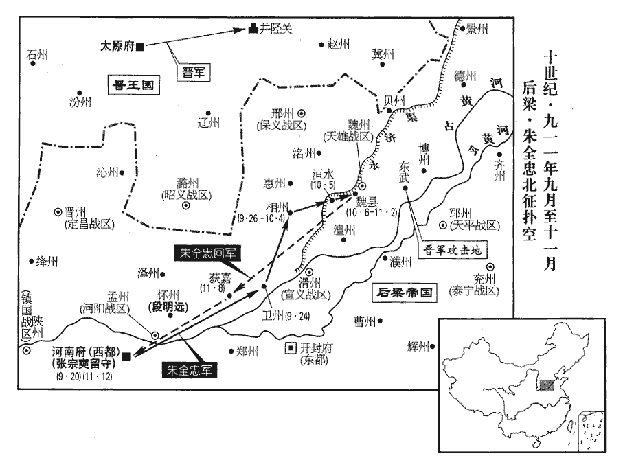 17九月,帝疾稍愈,聞晉、趙謀入寇,自將拒之。戊戌‹十八›,以張宗奭為西都留守。庚子‹二十›,帝發洛陽。甲辰‹二十四›,至衛州‹河南省卫辉市›,方食,軍前奏晉軍已出井陘‹河北省鹿泉市西›。陘,音刑。帝遽命輦北趣邢、洺‹河北省永年县东南旧永年镇›,晝夜倍道兼行。丙午‹二十六›,至相州‹河南省安阳市›,九域志:衛州北至相州一百二十五里,自相州又北則趣邢、洺。趣,七喻翻。聞晉兵不出,乃止。相州刺史李思安不意帝猝至,落然無具,坐削官爵。