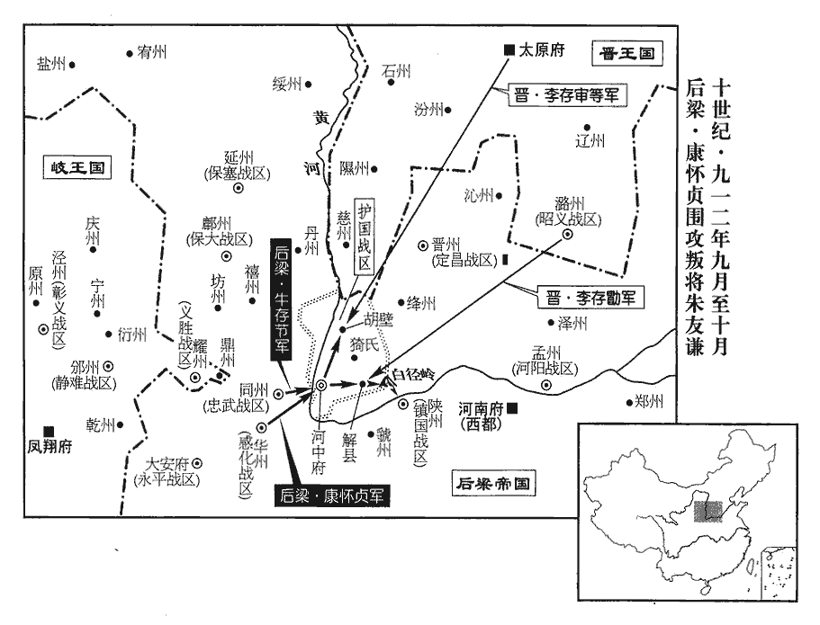 4岐王‹李茂贞›募華原‹陕西省耀县›賊帥溫韜以為假子,以華原為耀州,美原‹陕西省富平县东北美原镇›為鼎州。宋廢鼎州,復為美原縣,屬耀州。宋白曰:華原縣本漢祋duì祤yǔ縣地‹陕西省耀县东›,曹魏以來置北地郡,元魏廢帝三年置通川郡泥陽縣,隋開皇六年改泥陽為華原。美原縣本秦、漢頻陽縣,苻秦置土門護軍,後周置土門縣,唐咸亨二年改為美原。九域志:耀州在長安北一百六十里。置義勝軍,以韜為節度使,使帥邠、岐‹总部凤翔府›兵寇長安。詔感化‹总部设华州陕西省华县›節度使康懷貞、忠武‹总部设同州陕西省大荔县›節度使牛存節以同、華、河中‹山西省永济市›兵討之。己酉‹二十五›,懷貞等奏擊韜於車度‹陕西省大荔县西南›,走之。車度,地名,在長安北同州界。