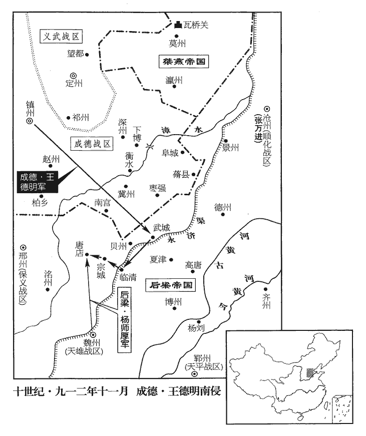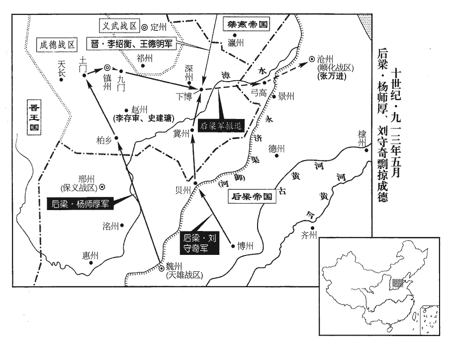 23楊師厚與劉守奇將汴‹开封府·河南省开封市›、滑‹河南省滑县›、徐‹江苏省徐州市›、兗‹山东省兖州市›、魏、博‹山东省聊城市›、邢‹河北省邢台市›、洺‹河北省永年县东南旧永年镇›之兵十萬大掠趙境‹成德总部设镇州河北省正定县›,楊師厚以燕、晉交兵,乘虛掠趙。師厚自柏鄉‹河北省柏乡县›入攻土門‹河北省鹿泉市西南›,趣趙州‹河北省赵县›,守奇自貝州‹河北省清河县›入趣冀州‹河北省冀州市›,九域志:柏鄉北至趙州七十餘里;貝州北至冀州一百二十餘里。趣,七喻翻。所過焚掠。庚戌‹九›,師厚至鎮州,九域志:趙州北至鎮州九十五里。營於南門外,燔其關城。壬子‹十一›,師厚自九門‹河北省藁城市西北›退軍下博‹河北省深州市东南下博镇›,守奇引兵與師厚會攻下博,拔之。晉將李存審、史建瑭戍趙州,兵少,趙王‹王镕,首府镇州›告急於周德威。德威遣騎將李紹衡會趙將王德明同拒梁軍。師厚、守奇自弓高‹河北省泊头市›渡御河而東,隋煬帝大業四年穿永濟渠,引沁水南達于河,北通涿郡,後人因謂之御河。逼滄州‹河北省沧州市东南›,張萬進‹顺化总部沧州›懼,請遷于河南;師厚表徙萬進鎮青州‹山东省青州市›,以守奇為順化‹总部设沧州›節度使。去年改滄州義昌軍為順化軍。