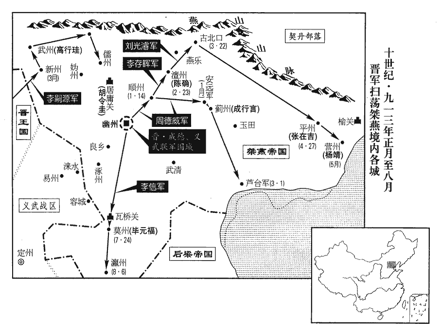 1春,正月,德威東出飛狐‹河北省涞源县›,自代州出飛狐。宋白曰:飛狐縣,漢代郡地。曹魏封樂進於廣昌侯國,後周於五龍城置廣昌縣;隋改飛狐縣,因縣北飛狐口為名。與趙王將王德明‹张文礼›、義武‹总部定州›將程巖會于易水‹流经河北省易县南›。趙王,王鎔。義武,王處直。丙戌‹七›,三鎮兵進攻燕‹首都幽州北京市›祁溝關‹河北省涿州市西南›,下之;三鎮,并、鎮、定。祁溝關在涿州南,易州拒馬河之北。自關而西至易州六十里。拒馬河東至新城縣四十里。戊子‹九›,圍涿州‹河北省涿州市›。宋白曰:涿州,古涿鹿地。漢高帝置涿郡,魏改范陽郡,取漢涿縣在范水之陽為名。唐大曆四年立涿州。南至莫州一百六十里,東北至幽州一百二十里。刺史劉知溫城守,守,手又翻。劉守奇‹刘仁恭的儿子›之客劉去非大呼於城下,呼,火故翻。謂知溫曰:「河東‹总部太原府›小劉郎‹刘守奇›來為父討賊,為,于偽翻。何豫汝事而堅守邪?」守奇免冑勞之,劉守奇奔晉,見二百六十六卷開平元年。勞,力到翻。知溫拜於城上,遂降。周德威疾守奇之功,譖諸晉王‹李存勖,本年二十八岁›,此周德威之褊也。降,戶江翻。王召之;守奇恐獲罪,與去非及進士趙鳳來奔,上‹朱全忠(朱温)本年六十一岁›以守奇為博州‹山东省聊城市›刺史。去非、鳳,皆幽州人也。先是,燕主守光籍境內丁壯,悉文面為兵,雖士人不免,鳳詐為僧奔晉,守奇客之。先,悉薦翻。