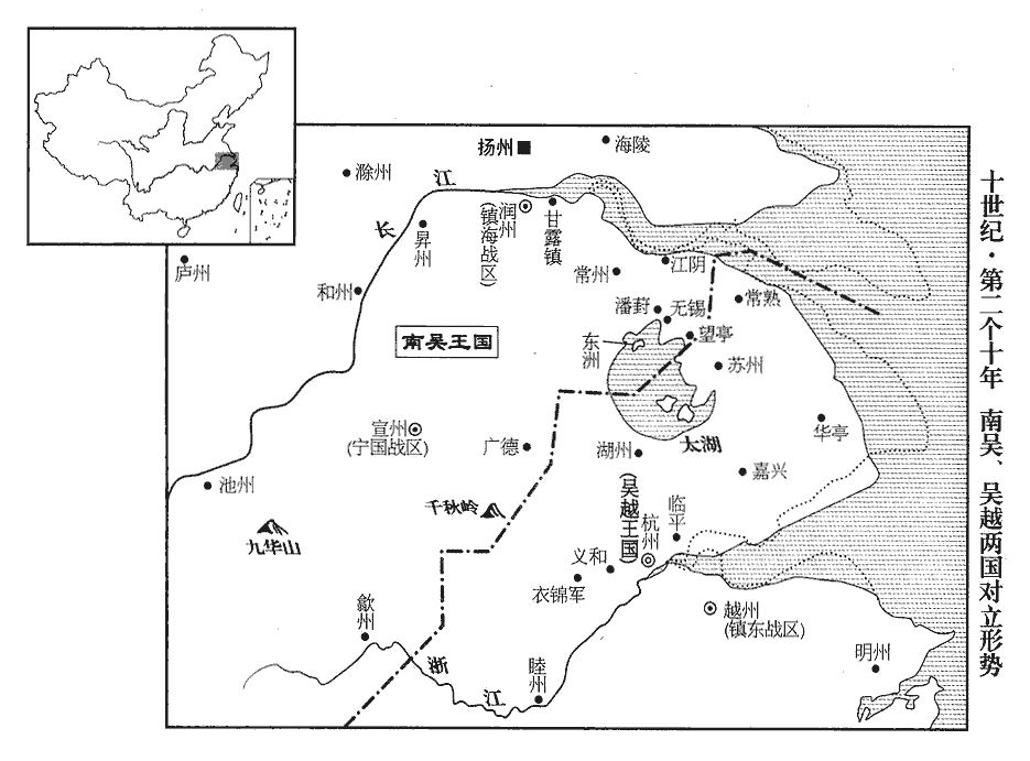 17吳‹首都扬州›行營招討使李濤帥眾二萬出千秋嶺‹安徽省宁国县东南›,攻吳越‹首都杭州›衣錦軍‹浙江省临安市›。自杭州東南度千秋嶺則至杭州臨安縣。薛史,梁開平二年改臨安縣廣義鄉為衣錦鄉。帥,讀曰率。衣,於既翻。吳越王鏐‹本年六十二岁›以其子湖州‹浙江省湖州市›刺史傳瓘為北面應援都指揮使以救之,睦州‹浙江省建德市›刺史傳璙為招討收復都指揮使,將水軍攻吳東洲‹江苏省常州市东南太湖湖畔›以分其兵勢。東洲,即常州東洲也。璙,力弔翻,又力小翻。