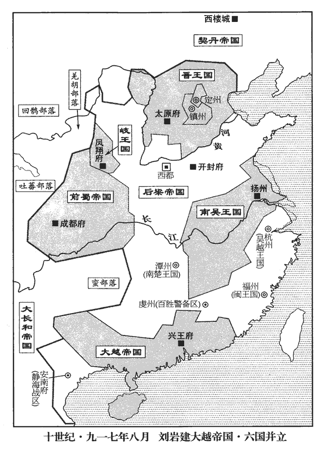 9越主巖遣客省使劉瑭使於吳‹首都扬州›,告即位,是年八月,劉巖稱帝。且勸吳王稱帝。
