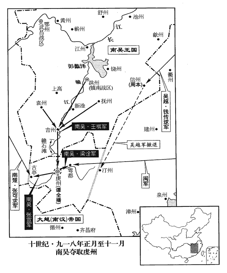 3吳‹首都扬州江苏省扬州市›以右都押牙王祺為虔州‹江西省赣州市›行營都指揮使,將洪‹江西省南昌市›、撫‹江西省临川市›、袁‹江西省宜春市›、吉‹江西省吉安市›之兵擊譚全播。嚴可求以厚利募贛石‹赣江上游赣石滩›水工,故吳兵奄至虔州城下,虔人始知之。虔州水行至吉州,有贛石之險。吳先募水工習於水道,故舟行無礙。註詳見辯誤。贛,音紺。