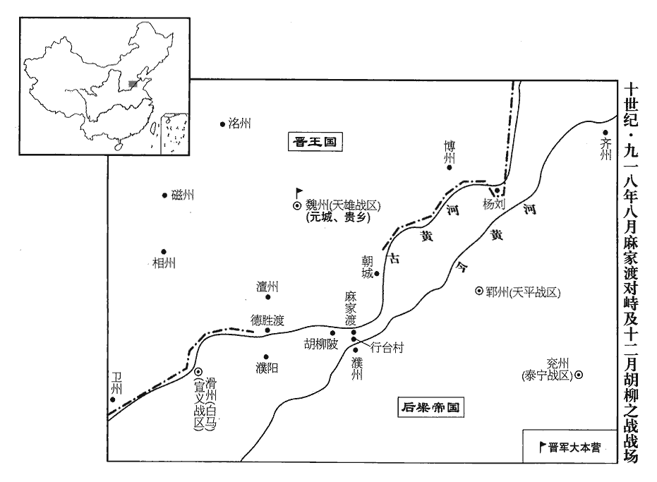 〖译文〗 [24]晋王从魏州到了杨刘,率兵抢掠郓、濮以后而回,他尚着黄河而上,驻扎在麻家渡。贺、谢彦章率后梁兵驻扎在濮州北面的行台村,两军相持不战。