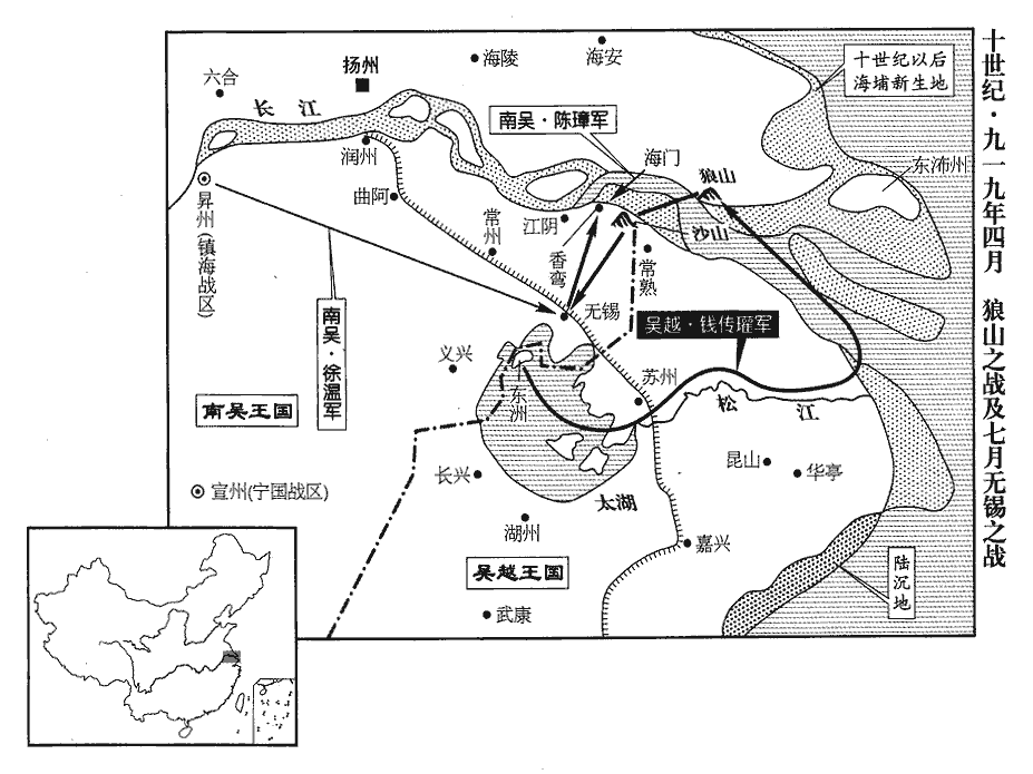 14秋,七月,吳越王鏐遣錢傳瓘將兵三萬攻吳常州‹江苏省常州市›,徐溫帥諸將拒之,右雄武統軍陳璋以水軍下海門‹江苏省海门市›出其後。海門在今通州東海門縣界,大江至此入海,遵海東南則太湖入海之口,舟行由此入太湖,可以達常州之東洲。壬申‹七›,戰于無錫‹江苏省无锡市›。會溫病熱,不能治軍,治,直之翻。吳越攻中軍,飛矢雨集,鎮海‹总部设昇州江苏省南京市›節度判官陳彦謙遷中軍旗鼓于左,取貌類溫者,擐甲冑,號令軍事,溫得少息;俄頃,疾稍間,間,如字。出拒之。時久旱草枯,吳人乘風縱火,吳越兵亂,遂大敗,殺其將何逢、吳建,斬首萬級。傳瓘遁去,追至山南,復敗之。復,扶又翻。敗,補邁翻;下同。陳璋敗吳越于香彎‹江苏省江阴市东十千米›。