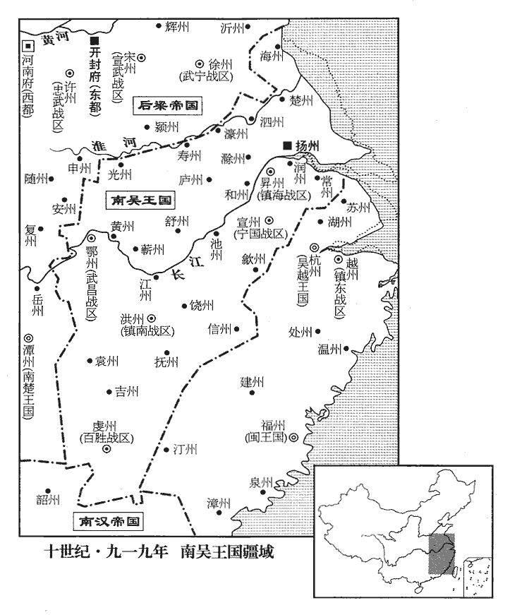 8吳‹首都扬州江苏省扬州市›徐溫帥將吏藩鎮請吳王‹杨隆演,本年二十三岁›稱帝,吳王不許。夏,四月,戊戌朔‹一›,即吳國王位。大赦,改元武義;建宗廟社稷,置百官,宮殿文物皆用天子禮。以金繼土,唐,土行也。吳欲繼唐,故言以金德王。臘用丑。改諡武忠王曰孝武王,廟號太祖,楊行密初諡武忠王。威王曰景王,楊渥初諡威王。尊母為太妃;以徐溫為大丞相、都督中外諸軍事、諸道都統、鎮海‹总部昇州›•寧國‹总部宣州›節度使,守太尉兼中書令、東海郡王,以徐知誥為左僕射、參政事兼知內外諸軍事,仍領江州‹江西省九江市›團練使,以揚府左司馬王令謀為內樞密使,吳都廣陵,故謂揚州為揚府。營田副使嚴可求為門下侍郎,鹽鐵判官駱知祥為中書侍郎,前中書舍人盧擇為吏部尚書兼太常卿,前中書舍人,蓋唐官也。掌書記殷文圭為翰林學士,館驛巡官游恭為知制誥,前駕部員外郎楊迢為給事中。擇,醴泉‹陕西省礼泉县›人;迢,敬之之孫也。敬之,楊憑弟子也。