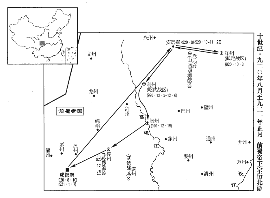 八月,戊辰‹十›,蜀主‹王宗衍›發成都,被金甲,冠珠帽,執弓矢而行,被,皮義翻。冠,古玩翻。旌旗兵甲,亘百餘里。雒‹汉州州政府所在县·四川省广汉市›令段融上言:雒,漢古縣,唐屬漢州,為州治所。上,時掌翻。「不宜遠離都邑‹成都府›,離,力智翻。當委大臣征討。」不從。九月,次安遠城‹陕西省汉中市西›。凡兵一宿為信,過信為次。