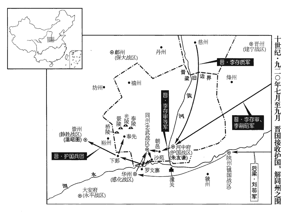 11劉鄩等圍同州,朱友謙求救于晉;秋,七月,晉王遣李存審、李嗣昭、李建及、慈州‹山西省吉县›刺史李存質將兵救之。