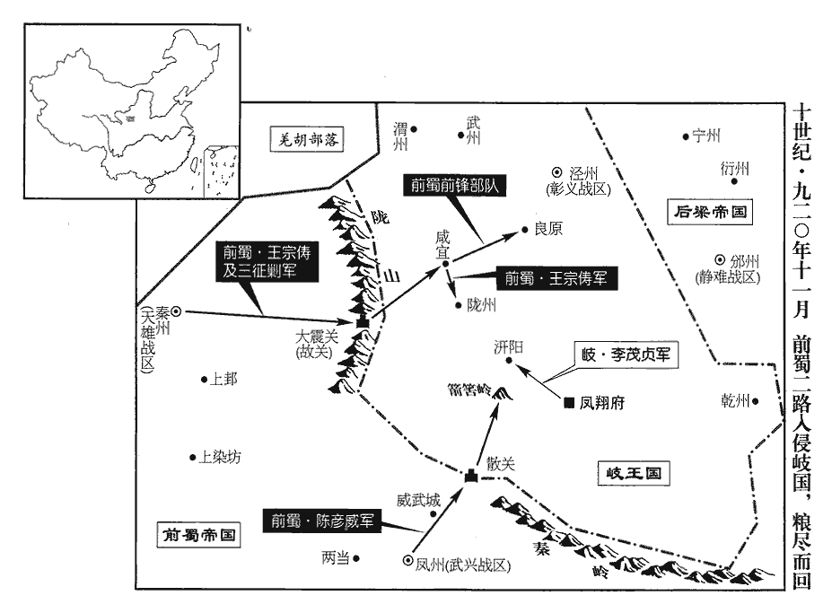 15十一月,戊子朔‹一›,蜀主以兼侍中王宗儔為山南‹总部设兴元府陕西省汉中市›節度使、西北面都招討、行營安撫使,天雄‹总部设秦州甘肃省秦安县西北›節度使•同平章事王宗昱、永寧軍使王宗晏、左神勇軍使王宗信為三招討以副之,將兵伐岐‹首都凤翔府›,出故關‹陕西省陇县西固关›,壁於咸宜‹陕西省陇县西北›,壁者,築壁壘以屯軍。咸宜當在隴州汧源縣界。入良原‹甘肃省灵台县西梁原镇›。良原縣屬涇州。九域志:在州西南六十里。丁酉‹十›,王宗儔攻隴州‹陕西省陇县›,岐王‹李茂贞(宋文通)›自將萬五千人屯汧陽‹陕西省千阳县›。汧陽縣屬隴州。九域志:在州東六十七里,東距鳳翔五十五里。癸卯‹十六›,蜀將陳彥威出散關‹陕西省宝鸡市西南›,敗岐兵于箭筈kuò嶺‹陕西省千阳县西南›,杜佑曰:岐山即今之岐山縣;其山兩岐,故俗呼為箭筈嶺。敗,補邁翻。筈,古活翻。蜀兵食盡。引還。還,從宣翻,又如字。宗昱屯泰【章:十二行本「泰」作「秦」;乙十一行本同;孔本同;張校同;退齋校同。】州‹秦州,甘肃省秦安县西北›,宗儔屯上邽‹甘肃省天水市›,宗晏、宗信屯威武城‹陕西省凤县东北›。