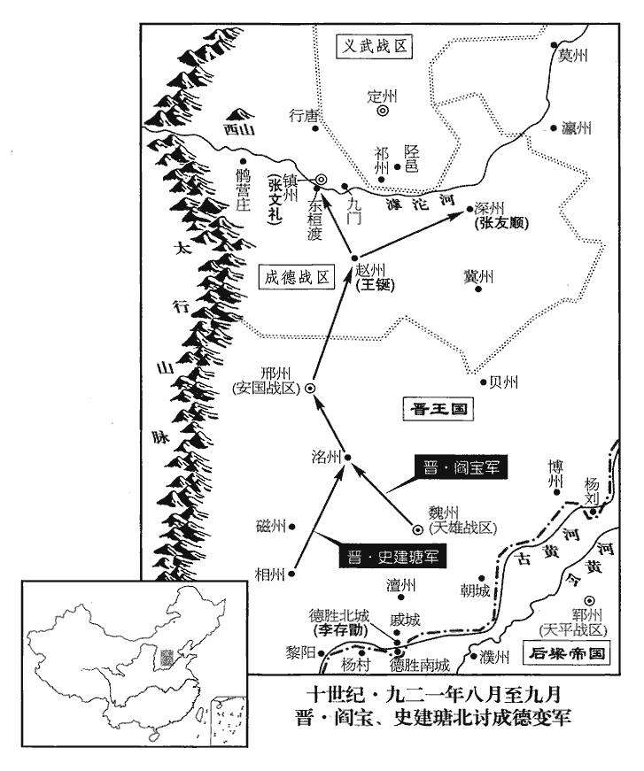 3晉王之北攻鎮州也,李存審謂李嗣源曰:「梁人聞我在南兵少,晉王以兵北伐,留李存審等守澶、魏,此兵之在南者也。不攻德勝‹河南省濮阳市›,必襲魏州。吾二人聚於此何為!不若分軍備之。」遂分軍屯澶州‹河南省内黄县东南›。時澶州治頓丘。戴思遠果悉楊村‹河南省濮阳市西九千米古黄河渡口›之眾趣魏州,趣,七喻翻。嗣源引兵先之,先,悉薦翻。軍於狄公祠下,唐狄仁傑刺魏州,有惠政,州人為之立祠。遣人告魏州,使為之備。思遠至魏店‹大名县西›,嗣源遣其將石萬全將騎兵挑戰。挑,徒了翻。思遠知有備,乃西渡洹水,拔成安‹河北省成安县›,大掠而還。還,從宣翻,又如字。又將兵五萬攻德勝北城‹河南省濮阳市›,重塹複壘,斷其出入,重,直龍翻。斷,音短。晝夜急攻之,李存審悉力拒守。晉王聞德勝勢危,二月,自幽州赴之,五日至魏州。思遠聞之。燒營遁還楊村。