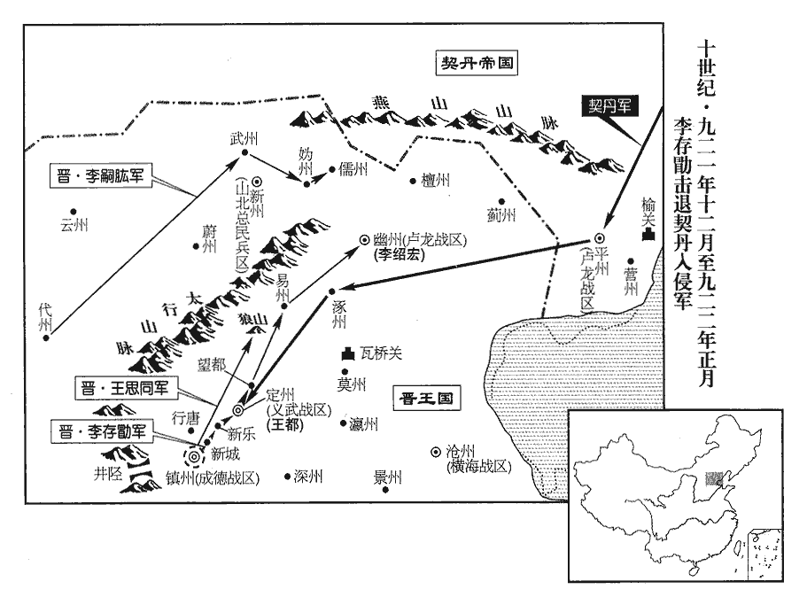 19契丹主‹耶律阿保机,本年五十岁›既許盧文進出兵,張文禮因盧文進求援於契丹,事見上。王郁又說之曰:說,式芮翻。「鎮州美女如雲,金帛如山,天皇王速往,則皆己物也,不然,為晉王所有矣。」契丹主以為然,悉發所有之眾而南。史言契丹為利所誘而來,未有取中國之心。述律后諫曰:「吾有西樓‹契丹首都·内蒙古巴林左旗›羊馬之富,其樂不可勝窮也,樂,音洛。勝,音升。何必勞師遠出以乘危徼利乎!徼,一遙翻。吾聞晉王用兵,天下莫敵,脫有危敗,悔之何及!」契丹主不聽。十二月,辛未‹二十›,攻幽州‹北京市›,李紹宏嬰城自守。貞明五年,晉王令李紹宏提舉幽州軍府事。契丹長驅而南,圍涿州‹河北省涿州市›,旬日拔之,擒刺史李嗣弼,進攻定州。自幽州西南至涿州一百二十里,自涿州至定州二百八十里。王都告急于晉,晉王自鎮州將親軍五千救之,遣神武都指揮使王思同將兵戍狼山‹河北省易县西南四十千米狼牙山›之南以拒之。狼山在定州西北二百里,東北至易州八十里。