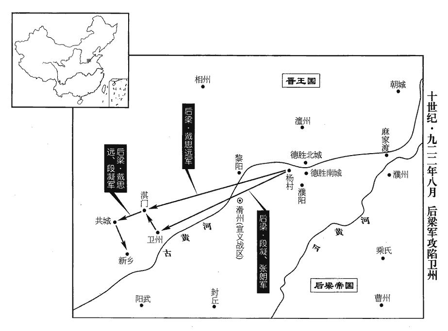 11晉衛州‹河南省卫辉市›刺史李存儒,本姓楊,名婆兒,以俳優得幸於晉王。頗有膂力,晉王賜姓名,以為刺史;專事掊斂,掊póu,蒲侯翻。斂,力贍翻。防城卒皆徵月課縱歸。月徵其課錢而免其防守之勞。八月,莊宅使段凝與步軍都指揮使張朗引兵夜渡河襲之,詰旦登城,詰,去吉翻。執存儒,遂克衛州,戴思遠又與凝攻陷淇門‹河南省淇县东南淇门渡›、共城‹河南省辉县市›、新鄉‹河南省新乡市›,共城、新鄉二縣皆屬衛州。舊唐書地理志曰:隋割汲、獲嘉二縣地,於古新樂城置新鄉縣。共城縣,漢共縣也,唐為共城縣。九域志:衛州治汲縣。熙寧六年廢新鄉縣為鎮,屬汲縣。汲縣又有淇門鎮。共城在州西北五十五里。共,音恭。於是澶州‹河南省内黄县东南›之西,相州‹河南省安阳市›之南,皆為梁有;九域志:澶州西至衛州二百四十里。相州南至衛州一百五十里。晉人失軍儲三之一,梁軍復振。帝‹朱友贞,本年三十五岁›以張朗為衛州刺史。朗,徐州‹江苏省徐州市›人也。