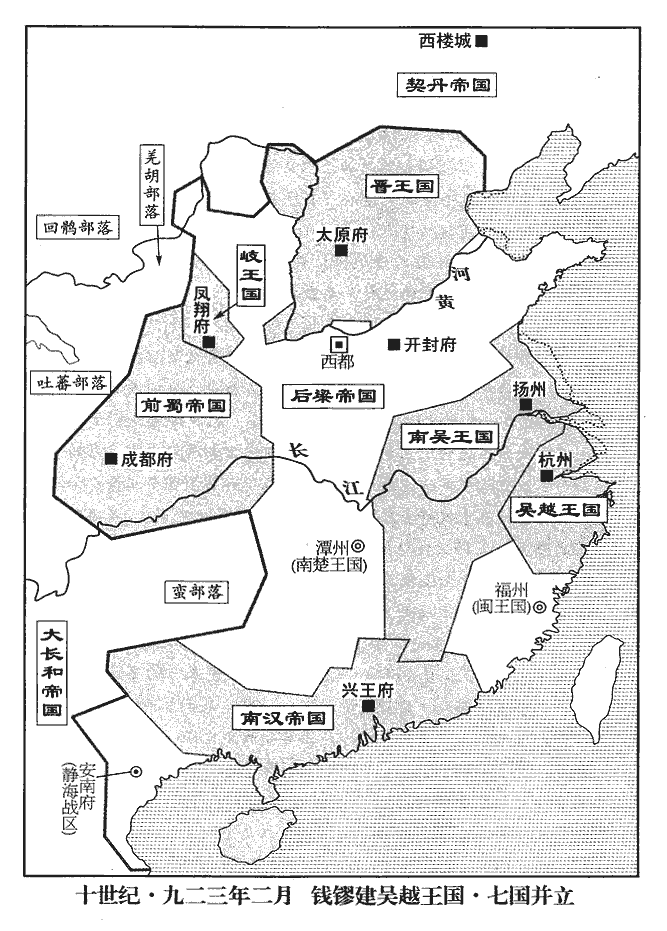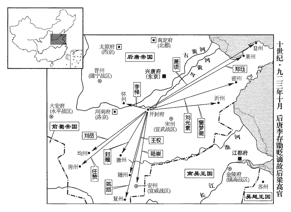 45以耀州‹陕西省耀县›為順義軍,延州‹陕西省延安市›為彰武軍,鄧州‹河南省邓州市›為威勝軍,晉州‹山西省临汾市›為建雄軍,安州‹湖北省安陆市›為安遠軍;帝既滅梁,特改梁所置軍名耳,凡諸藩帥未之易也。梁改耀州曰崇州,改義勝軍為靜勝軍,乃岐所置。延州,唐保塞軍,岐為忠義軍。鄧州,梁為宣化軍。晉州,梁始為定昌軍,後改建寧軍。安州,梁為宣威軍。自餘藩鎮,皆復唐舊名。
