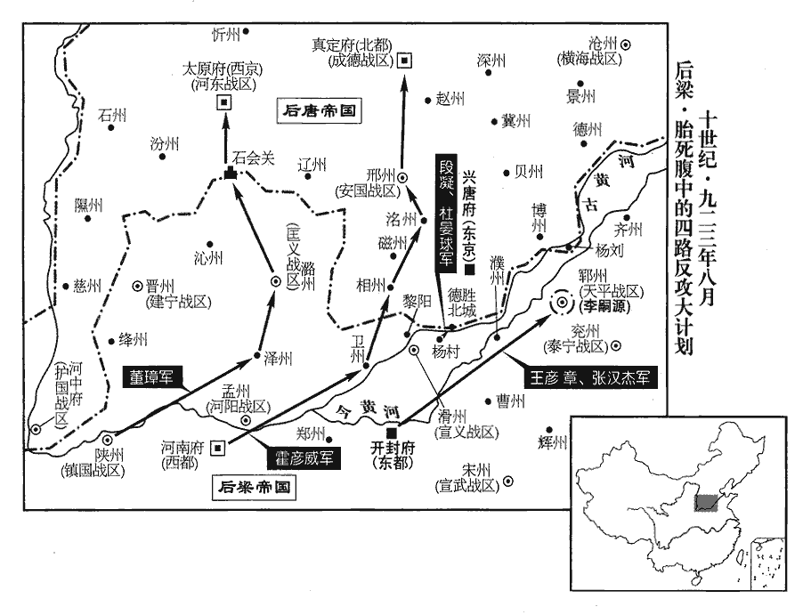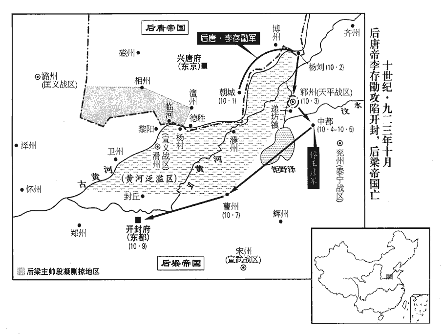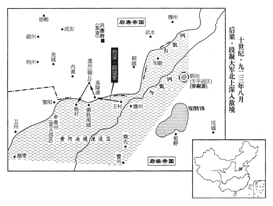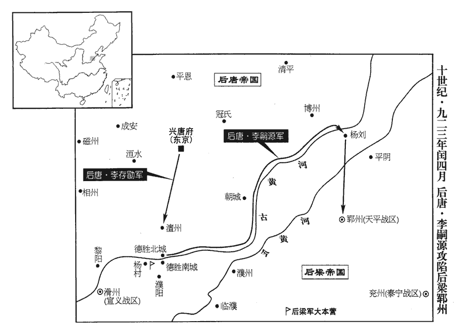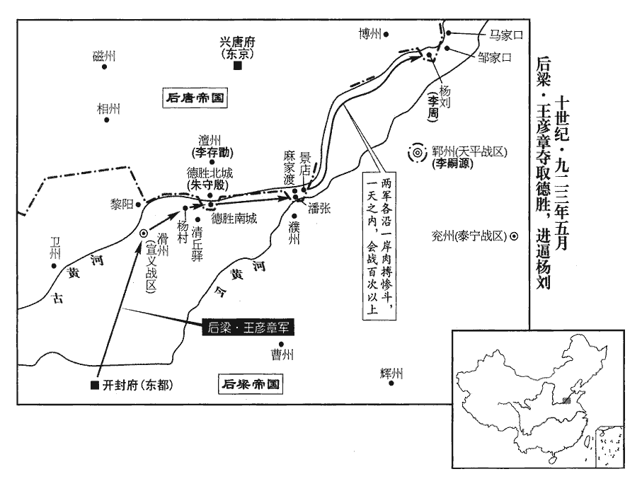 6梁主‹朱友贞›召問王彥章以破敵之期,彥章對曰:「三日。」左右皆失笑。自大梁出師拒晉,三日不能至河上,故笑其言。彥章出,兩日,馳至滑州‹河南省滑县›。九域志:大梁北至滑州二百一十里。辛酉‹十八›,置酒大會,陰遣人具舟於楊村‹河南省濮阳市西九千米古黄河渡口›;夜命甲士六百,皆持巨斧,載冶者具鞴bèi炭,乘流而下。楊村順流趣德勝,水程十八里耳。鞴,蒲拜翻,韋囊也,鼓以吹火。會飲尚未散,彥章陽起更衣,引精兵數千循河南岸趨德勝‹河南省濮阳市南›。更,工衡翻。趨,七喻翻。天微雨,朱守殷不為備,舟中兵舉鎖燒斷之,因以巨斧斬浮橋,而彥章引兵急擊南城。浮橋斷,南城遂破,【章:十二行本「破」下有「斬首數千級」五字;乙十一行本同;孔本同;張校同。】時受命適三日矣。守殷以小舟載甲士濟河救之,不及。彥章進攻潘張、麻家口、景店諸寨‹都是后唐在古黄河南岸建立的营寨›,皆拔之,潘、張二姓同居一村,因以為名。店,都念翻。崔豹古今注曰:店,所以置貨鬻物也。有姓景者先嘗設店於其地,因以為名。凡此皆河津之要,晉人立寨守之。聲勢大振。