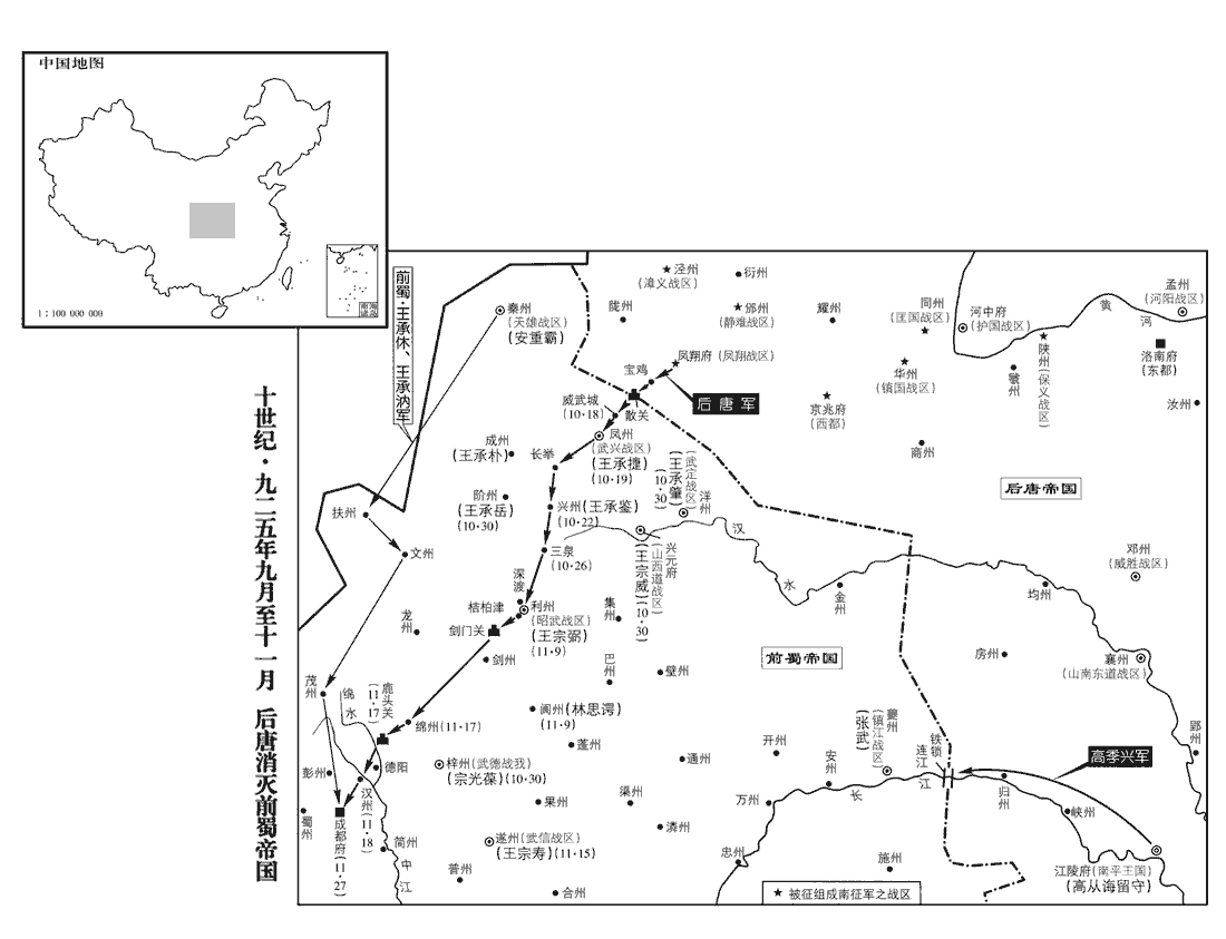 34丁丑‹十八›,李紹琛攻蜀威武城‹陕西省凤县东北›,蜀指揮使唐景思將兵出降;城使周彥禋yīn等知不能守,亦降,考異曰:實錄:「十月,戊寅,魏王繼岌至鳳州,王承捷以鳳、興、文、成四州降。前一日,康延孝、李嚴至故鎮威武城,唐景思等降。」按今故鎮在鳳州西四程,延孝未下鳳州,何能先至故鎮!又蜀之守禦必在鳳州之東,或者當時鳳州之東別有威武城亦名故鎮、非今之故鎮歟?景思,秦州人也。得城中糧二十萬斛。紹琛縱其敗兵萬餘人逸去,因倍道趣鳳州‹陕西省凤县›。縱敗兵先去以懼蜀人,而倍道踵其後以趣鳳州。趣,七喻翻。李嚴飛書以諭王承捷。李繼曮竭鳳翔蓄積以饋軍,不能充,人情憂恐。郭崇韜入散關‹陕西省宝鸡市西南›,指其山‹秦岭›曰:「吾輩進無成功,不得復還此矣。當盡力一決。一決者,一決戰也。復,扶又翻;下同。今饋運將竭,宜先取鳳州,因其糧。」諸將皆言蜀地險固,未可長驅,宜按兵觀釁。崇韜以問李愚,愚曰:「蜀人苦其主荒淫,莫為之用。宜乘其人心崩離,風驅霆擊,彼皆破膽,雖有險阻,誰與守之!兵勢不可緩也。」是日李紹琛告捷,是日,崇韜入散關之日也,蓋即丁丑。崇韜喜,謂李愚曰:「公料敵如此,吾復何憂!」乃倍道而進。復,扶又翻。戊寅‹十九›,王承捷以鳳‹陕西省凤县›、興‹陕西省略阳县›、文‹甘肃省文县›、扶‹四川省九寨沟县›四州印節迎降,四州州印及武興節度使印及旌節也。得兵八千,糧四十萬斛。崇韜曰:「平蜀必矣。」兵威已振,有糧可因,知功必成。即以都統牒命承捷攝武興‹总部设凤州陕西省凤县›節度使。