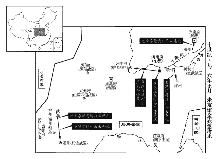 景進言:「河中‹山西省永济市›人有告變,言李繼麟‹朱友谦·护国总部河中府›與郭崇韜謀反;崇韜死,又與存乂連謀。」宦官因共勸帝速除之,帝乃徙繼麟為義成‹总部设滑州河南省滑县›節度使,是夜,遣蕃漢馬步使朱守殷以兵圍其第,歐史作「圍其館」,蓋謂朱友謙無私第在洛陽也。驅繼麟出徽安門外殺之,復其姓名曰朱友謙。唐昭宗之遷洛也,車駕由徽安門入宮。唐六典:東都北面二門,東曰延喜,西曰徽安。朱友謙賜姓名見二百七十二卷元年。友謙二子,令德為武信‹总部设遂州四川省遂宁市›節度使,令錫為忠武‹总部设许州河南省许昌市›節度使;詔魏王繼岌誅令德於遂州‹四川省遂宁市›,鄭州‹河南省郑州市›刺史王思同誅令錫於許州‹河南省许昌市›,唐置忠武軍於許州、匡國軍於同州,至梁之時兩易軍號,後唐滅梁,皆復其故。河陽‹总部设孟州河南省孟州市›節度使李紹奇‹夏鲁奇›誅其家人於河中。紹奇至其家,友謙妻張氏帥家人二百餘口見紹奇帥,讀曰率。曰:「朱氏宗族當死,願無濫及平人。」乃別其婢僕百人,別,彼列翻。以其族百口就刑。張氏又取鐵券以示紹奇曰:「此皇帝‹李存勖›去年所賜也,我婦人,不識書,不知其何等語也。」紹奇亦為之慚。為,于偽翻。慚朝廷之失信。友謙舊將史武等七人,時為刺史,皆坐族誅。
