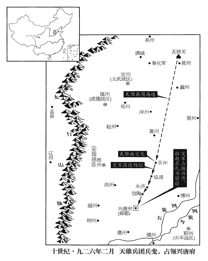 17庚子‹十三›,邢州‹河北省邢台市›左右步直兵趙太等四百人步直兵,謂步兵長直者也。據城自稱安國‹总部设邢州河北省邢台市›留後;詔東北面招討副使李紹真討之。李紹真即霍彥威。