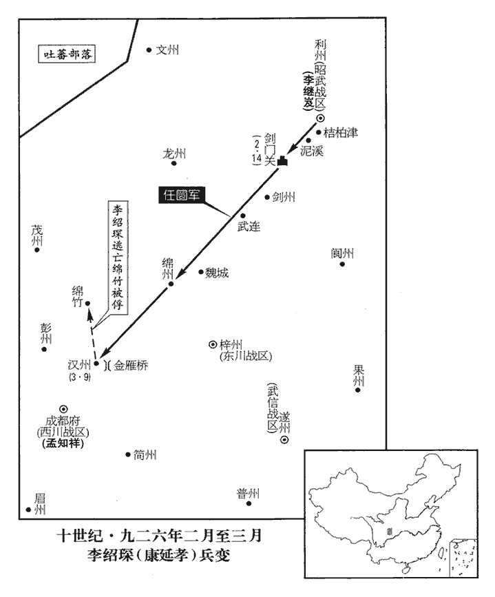 14郭崇韜之死也,李紹琛‹康延孝›謂董璋曰:「公復欲呫chè囁誰門乎?」復,扶又翻。璋懼,謝罪。魏王繼岌軍還至武連‹四川省剑阁县西南武连镇›,還,從宣翻。武連,漢梓潼縣地,宋置武都郡及下辨縣,又改下辨為武功縣,後魏改為武連縣,唐屬劍州。九域志:在州西八十五里。遇敕使,諭以朱友謙已伏誅,令董璋將兵之遂州誅朱令德。時紹琛將後軍在魏城‹四川省绵阳市东北魏城镇›,西魏置魏城縣於巴西,唐屬綿州。九域志:在州東六十五里。宋白曰:魏城本漢涪縣地,西魏於涪縣立潼州,析此立為魏城縣。李膺記云:肆溪東五十里有東西井,井西為涪縣界,井東為魏城界。聞之,以帝不委己殺令德而委璋,大驚。俄而璋過紹琛軍,不謁。紹琛怒,乘酒謂諸將曰:「國家南取大梁,西定巴、蜀,皆郭公之謀而吾之戰功也;至於去逆效順,與國家犄角以破梁,則朱公也。犄,居蟻翻。謂朱友謙以蒲、同附晉,相為犄角以破梁。今朱、郭皆無罪族滅,歸朝之後,行及我矣。朝,直遙翻。冤哉,天乎!柰何!」紹琛所將多河中兵,將,即亮翻。河中將焦武等號哭於軍門曰:「西平王何罪,闔門屠膾!號,戶刀翻。朱友謙再以河中附晉,晉封為西平王。闔門屠膾,謂其家悉誅夷也。我屬歸則與史武等同誅,言史武等既以河中將誅,若東歸則亦與之同罪而誅死。決不復東矣。」復,扶又翻。是日,魏王繼岌至泥溪‹四川省广元市西南›,紹琛至劍州‹四川省剑阁县›遣人白繼岌云:「河中將士號哭不止,欲為亂。」丁酉‹十›,紹琛自劍州擁兵西還,自稱西川節度、三川制置等使,移檄成都,稱奉詔代孟知祥招諭蜀人,三日間眾至五萬。