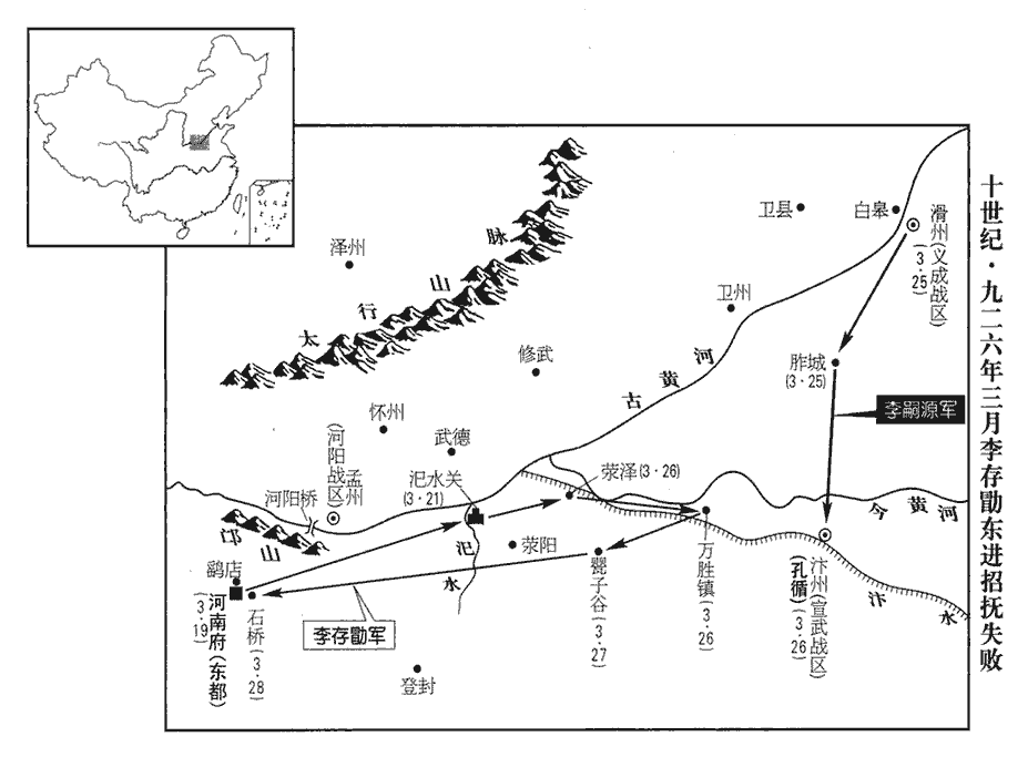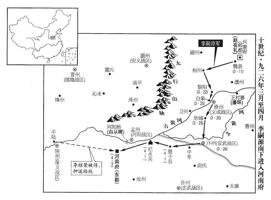 36癸酉‹十七›,詔懷遠指揮使白從暉將騎兵扼河陽橋‹河南省孟州市黄河大桥›,恐李嗣源自懷、孟犯洛也。帝乃出金帛給賜諸軍,樞密宣徽使及供奉內使景進等皆獻金帛以助給賜。事已至此,帝及嬖倖始知財物之不可守。軍士負物而詬曰:「吾妻子已殍piǎo死,得此何為!」詬,古候翻,又許候翻。殍,被表翻。甲戌‹十八›,李紹榮自衛州至洛陽,帝如鷂店‹洛阳市北›勞之。薛史作「耀店」。紹榮曰:「鄴都亂兵已遣其黨翟建白據博州‹山东省聊城市›,欲濟河襲鄆‹山东省东平县›、汴‹河南省开封市›,李紹榮所言指趙在禮所遣兵也,殊不知李嗣源已定入汴之計矣。勞,力到翻。翟,萇伯翻。願陛下幸關東招撫之。」帝從之。關東,謂汜水關以東。