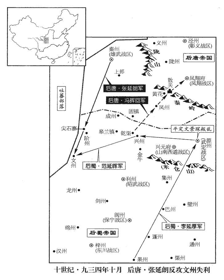 11山南西道節度使張虔釗之討鳳翔也,留武定節度使孫漢韶守興元。虔釗既敗,奔歸興元,與漢韶舉兩鎮之地降于蜀;蜀主‹孟知祥›命奉鑾肅衛馬步都指揮使、昭武‹总部设利州四川省广元市›節度使李肇將兵五千還利州,李肇本鎮昭武,蜀主召之入領宿衛,今使將兵還鎮以應接梁、洋。右匡聖馬步都指揮使、寧江‹总部设夔州重庆市奉节县›節度使張業將兵一萬屯大漫天‹四川省广元市北明月峡›以迎之。先是,蜀主以兵疲民困,不用趙隱取山南之計,今乘時而坐得之,其庸多矣。