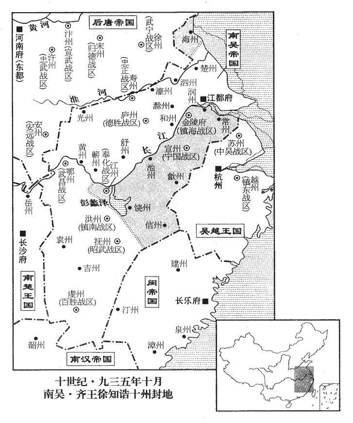 32吳加中書令徐知誥尚父、太師、大丞相、大元帥,進封齊王,備殊禮,以昇‹金陵府·江苏省南京市›、潤‹江苏省镇江市›、宣‹安徽省宣州市›、池‹安徽省贵池市›、歙‹安徽省歙县›、常‹江苏省常州市›、江‹江西省九江市›、饒‹江西省波阳县›、信‹江西省上饶市›、海‹江苏省连云港市›十州為齊國;考徐知誥所封十州,自潤循江而上,至于江則中斷吳國之腰膂,江都之與洪、鄂,脈理不屬矣。自常、潤波海界淮而有海州,則有包舉吳國之勢。其規圖自以為得,當是時合全吳之人歸心知誥,何必如是而後篡也。歙,書涉翻。知誥辭尚父、丞相,殊禮不受。