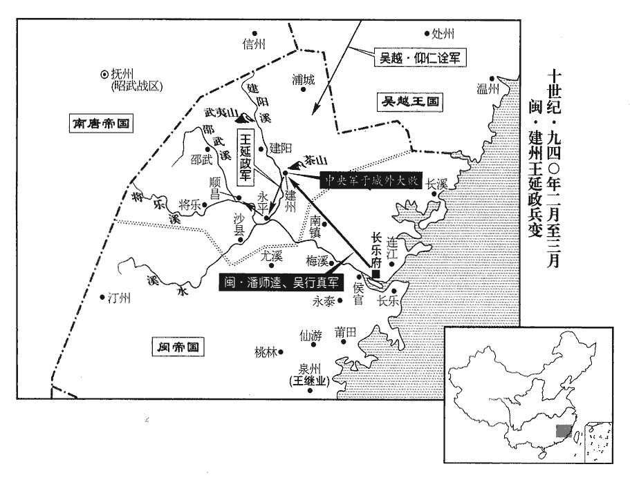 2王延政城建州‹福建省建瓯市›,周二十里,請於閩王曦,欲以建州為威武軍,自為節度使。曦以威武軍福州也,乃以建州為鎮安軍,以延政為節度使,封富沙王;建州本漢冶縣地,後分冶地南部曰建安;唐置建州。州有古富沙驛。又南劍州管內有富沙里。延政改鎮安曰鎮武而稱之。