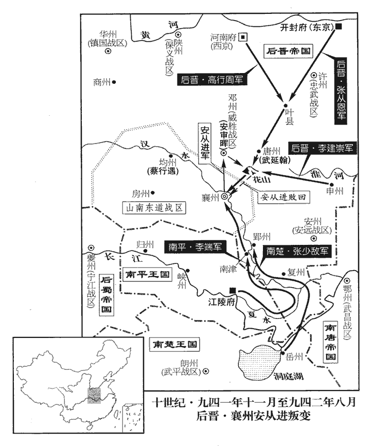 12山南東道‹总部设襄州湖北省襄樊市›節度使安從進謀反,遣使奉表詣蜀,請出師金‹陕西省安康市›、商‹陕西省商州市›以為聲援;自金、商取道均、房則至襄陽。丁亥‹二十八›,使者至成都。蜀主‹孟昶(孟仁赞)›與群臣謀之,皆曰:「金、商險遠,少出師則不足制敵,多則漕輓wǎn不繼。」水運曰漕,陸運曰輓。輓,音晚。蜀主乃辭之。又求援於荊南‹总部江陵府›,高從誨遺從進書,遺,唯季翻。諭以禍福;從進怒,反誣奏從誨。荊南行軍司馬王保義勸從誨具奏其狀,且請發兵助朝廷討之;從誨從之。