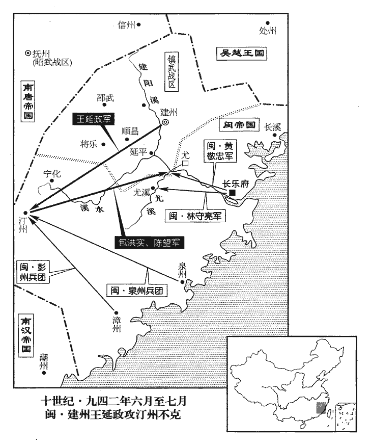 17閩富沙王延政圍汀州‹福建省长汀县›,閩主曦發漳‹福建省漳州市›、泉‹福建省泉州市›兵五千救之。九域志:泉州西至漳州二百九十五里,漳州西至汀州五百四十里。宋白曰:梁山有漳浦水,一名漳溪水,唐垂拱二年,析泉州之西南置漳州。垂拱之泉州,今之福州也。又遣其將林守亮入尤溪‹福建省南平市东南尤溪口镇›,大明宮使黃敬忠屯尤口‹尤溪注入闽江处·福建省南平市东南尤溪口镇›,九域志:尤溪縣在南劍州南一百五十五里,蓋王氏初置縣也。尤口,尤溪口也。欲乘虛襲建州‹福建省建瓯市›;國計使黃紹頗將步卒八千為二軍聲援。