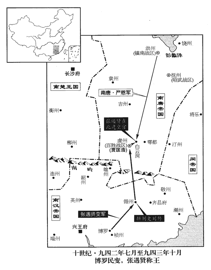 27唐主遣洪州‹江西省南昌市›營屯都虞候嚴恩將兵討張遇賢,以通事舍人金陵邊鎬為監軍。鎬用虔州人白昌裕為謀主,擊張遇賢,屢破之。遇賢禱於神,神不復言,復,扶又翻。其徒大懼。昌裕勸鎬伐木開道,出其營後襲之,遇賢棄眾奔別將李台。台知神無驗,執遇賢以降,斬於金陵市。去年七月,張遇賢作亂於漢境,入唐境而亡。史言依託怪妄之禍敗。降,戶江翻。
