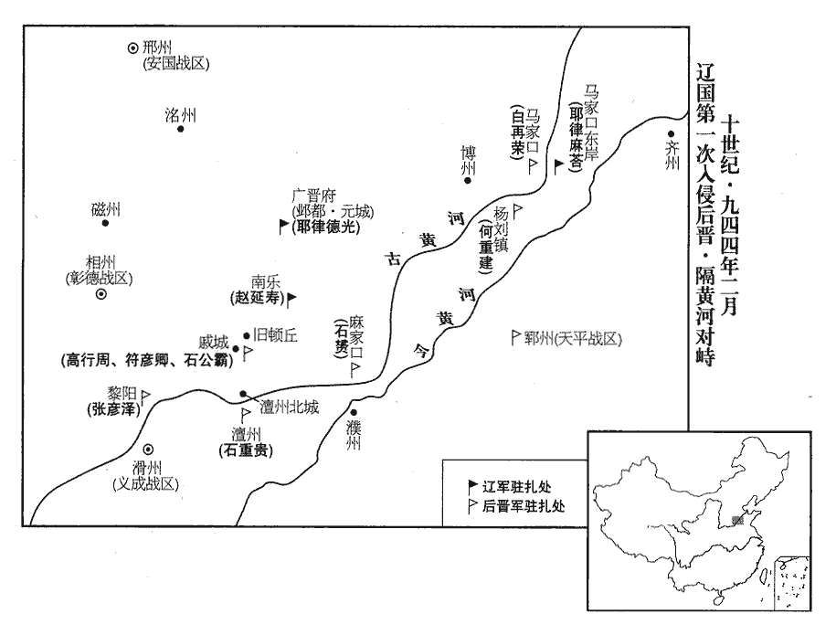 1二月,甲辰朔‹一›,命前保義節度使石贇守麻家口‹河南省范县南›,前威勝‹总部设邓州河南省邓州市›節度使何重建守楊劉鎮‹山东省东阿县东北杨柳乡›,護聖都指揮使白再榮守馬家口,西京‹河南府·河南省洛阳市›留守安彥威守河陽‹河南省孟州市›。贇yūn,於倫翻。按是時凡緣河津要,皆以兵守之,亦由燕、冀、瀛、莫既入于北,遼人南寇,了無關山塘濼之阻,其兵可以徑造河上,故不得不緣河為備也。未幾,周儒引契丹將麻荅自馬家口濟河,營於東岸,攻鄆州北津以應楊光遠。麻荅,契丹主之從弟也。幾,居豈翻。從,才用翻。鄆,音運。