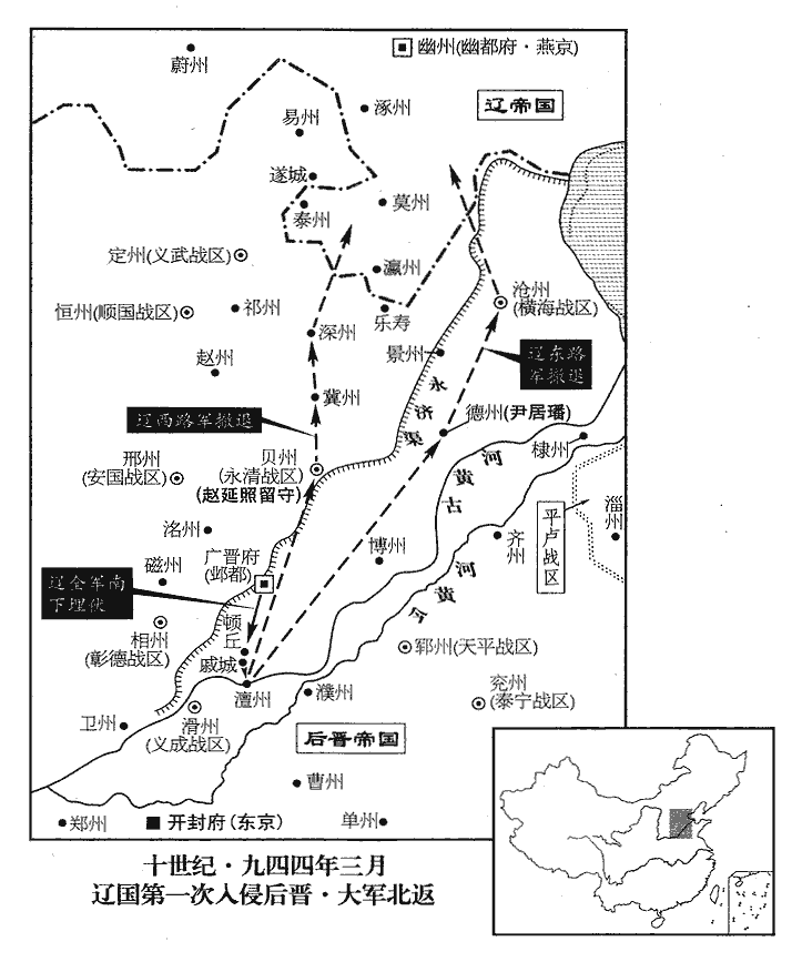 8契丹主自澶州北分為两軍,一出滄‹河北省沧州市东南›、德‹山东省陵县›,一出深‹河北省深州市›、冀‹河北省冀州市›而歸。所過焚掠,方廣千里,廣,古曠翻。民物殆盡。留趙延照為貝州留後。麻荅陷德州,擒刺史尹居璠。璠,音煩。