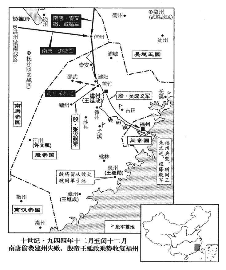 4閩‹首都长乐府福建省福州市›之故臣共迎殷主延政,請歸福州,改國號曰閩。延政以方有唐兵,未暇徙都,以從子門下侍郎、同平章事繼昌都督南都‹长乐府·福建省福州市›內外諸軍事,鎮福州;殷主居建州,故以福州為南都。以飛捷指揮使黃仁諷為鎮遏使,將兵衛之。