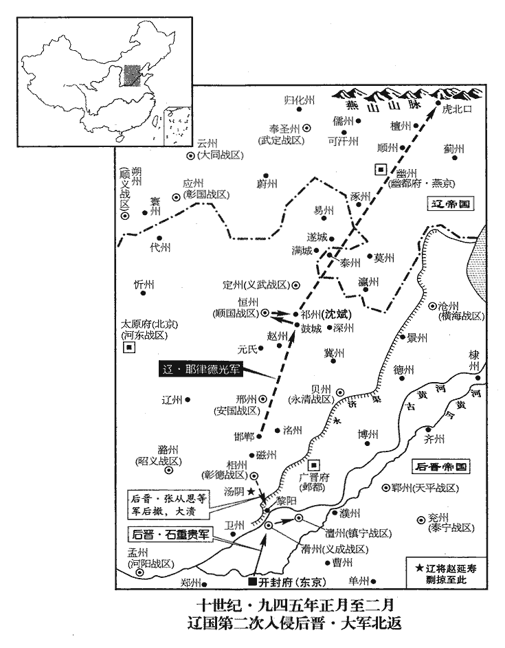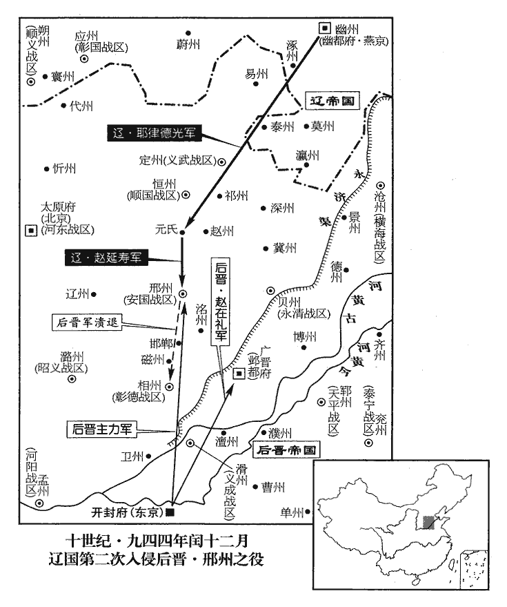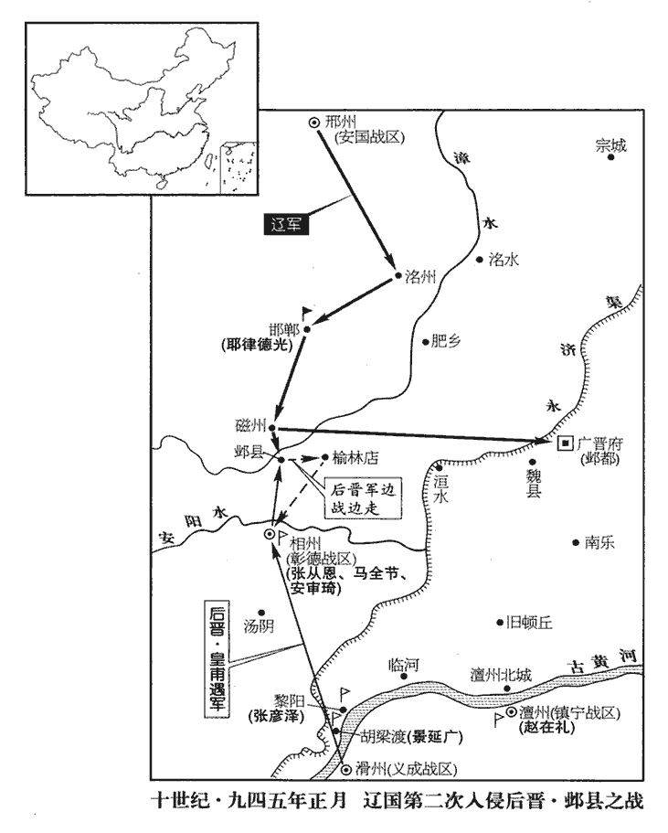 契丹亦引軍退,其眾自相驚曰:「晉軍悉至矣!」時契丹主‹耶律德光,本年四十四岁›在邯鄲‹河北省邯郸市›,聞之,即時北遁,不再宿,至鼓城‹河北省晋州市›。邯鄲縣屬磁州,在州東北七十里。鼓城縣屬恒州,宋端拱二年,以鼓城隸祁州,在州西南一百里。自邯鄲至鼓城約三百餘里。