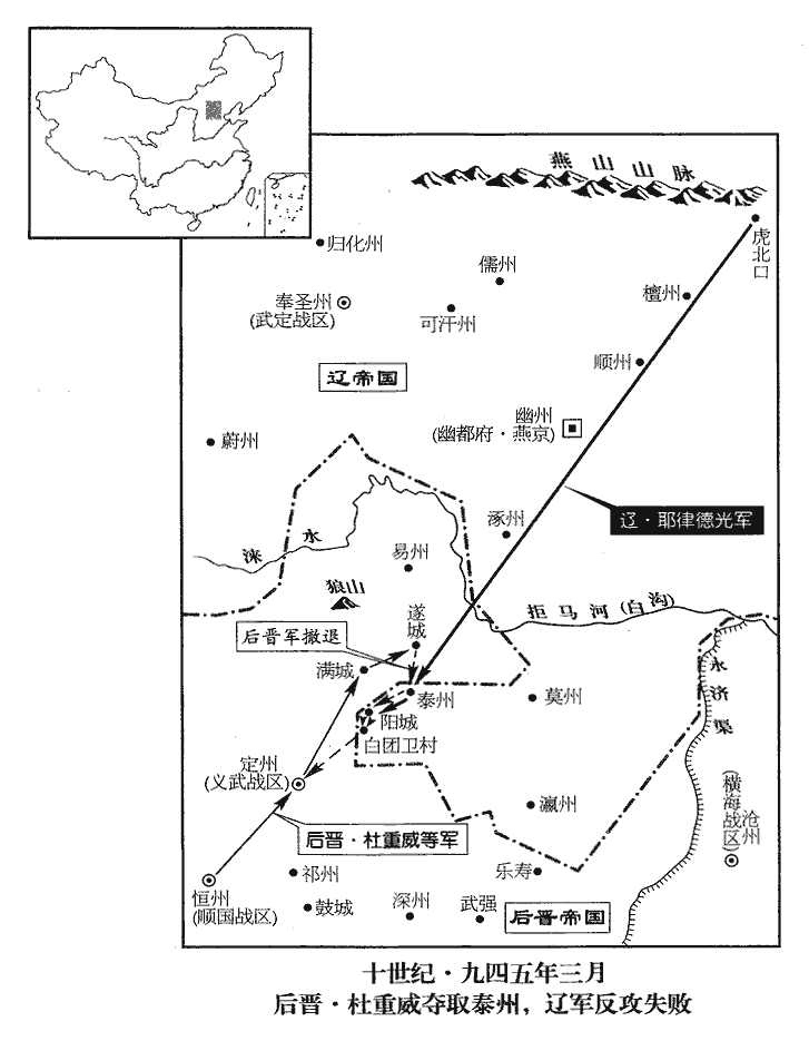11乙巳‹九›,杜威‹顺国总部设恒州河北省正定县›等諸軍會于定州‹河北省定州市›,以供奉官蕭處鈞權知祁州事。庚戌‹十四›,諸軍攻契丹,泰州‹河北省保定市›刺史晉廷謙舉州降。晉,姓也,以國為氏。甲寅‹十八›,取滿城‹河北省满城县›,按五代會要,是年九月,徙泰州治滿城。是時泰州猶治清苑。宋白曰:滿城本漢北平縣,後魏置永樂縣,天寶元年,改滿城縣。獲契丹酋長沒剌酋,慈秋翻。長,知兩翻。剌,來達翻。及其兵二千人。乙卯‹十九›,取遂城‹河北省徐水县西遂城镇›。趙延壽部曲有降者言:「契丹主還至虎北口‹北京市密云县东北古北口›,太原汾水之北,亦有地名虎北口。時契丹兵自祁、易北去,非其路也,此乃幽、檀以北之古北口。宋人使遼行程記云:自檀州北行八十里,又八十里至虎北口館。則檀州之古北口亦名虎北口也。聞晉取泰州,復擁眾南向,復,扶又翻。約八萬餘騎,計來夕當至,宜速為備。」杜威等懼,丙辰‹二十›,退保泰州。
