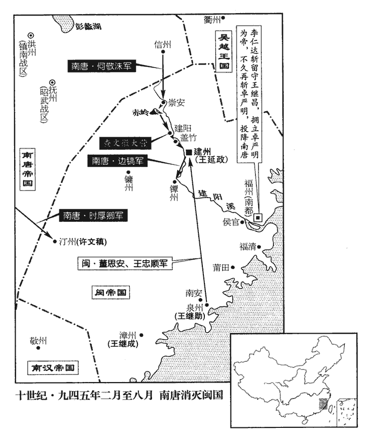 福州使者至錢塘‹吴越首都杭州州政府所在县›,乞師之使。錢塘,吳越國都。吳越王弘佐‹钱弘佐,本年十八岁›召諸將謀之,皆曰:「道險遠,難救。」惟內都監使臨安‹浙江省临安市›水丘昭券以為當救。水丘,複姓也。何氏姓苑云:漢有司隸校尉水丘岑。今為臨安著姓。弘佐曰:「脣亡齒寒,古語多有之。吾為天下元帥,曾不能救鄰道,將安用之!諸君但樂飽身【章:十二行本「身」作「食」;乙十一行本同;張校同。】安坐邪!」樂,音洛。壬午‹二十五›,遣統軍【章:十二行本「軍」下有「使」字;乙十一行本同;孔本同;張校同。】張筠、趙承泰將兵三萬,水陸救福州。吳越救福州,自婺、衢至建、劍,順流可至福州。是時劍、建已為南唐守,此道不可由也。自溫州之平陽渡海浦至福州界,當由此道耳。