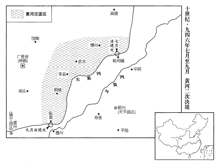 11秋,七月,河決楊劉‹山东省东阿县东北杨柳乡›,西入莘縣‹山东省莘县›,廣四十里,自朝城‹山东省莘县西南朝城镇›北流。莘縣在魏州之東,朝城在魏州東南,相去四十里。廣,古曠翻。