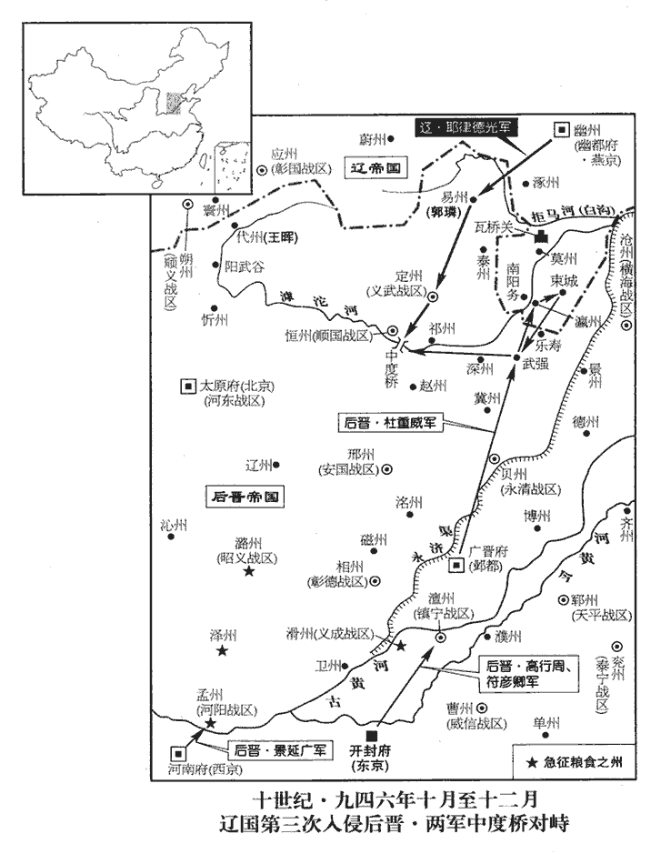 28契丹主‹耶律德光,本年四十五岁›大舉入寇,自易‹河北省易县›、定‹河北省定州市›趣恆州‹河北省正定县›。趣,七喻翻。恆,戶登翻。杜威等至武強‹河北省武强县›,九域志:武強縣在深州西四十五里。宋白曰:武強,六國時武隧,地屬趙,故城在今縣東北三十里,是為漢武強縣。郡國縣道記云:古武強縣城,在今縣西南二十五里,是為晉武強縣。高齊移縣於後魏武邑郡故城,今縣理是也。聞之,將自貝‹河北省清河县›、冀‹河北省冀州市›而南。彰德節度使張彥澤時在恆州,去年九月,遣張彦澤戍恒州以備契丹。恒,户登翻。引兵會之,言契丹可破之狀;威等復趣恒州,復,扶又翻。趣,七喻翻。以彥澤為前鋒。考異曰:備史曰:「彥澤狼子,其心密已變矣,乃通款邪律氏,請為前導,因促騎說威引軍沿滹沱水西援常山。及至真定東垣渡,與威通謀,先遣步眾跨水,不之救,致敗,將沮人心以行詭計,因促監者高勳請降於虜。」按彥澤與威若已通款於契丹,則彥澤何故猶奪橋,契丹何故猶議回旋?今不取。甲寅‹二十七›,威等至中度橋‹河北省正定县东南滹沱河桥›,滹沱水逕恆州東南,恆州之人各隨便為津渡之所。此為中度者,明上下流各有度也。契丹已據橋,彥澤帥騎爭之,帥,讀曰率。契丹焚橋而退。晉兵與契丹來滹沱而軍。