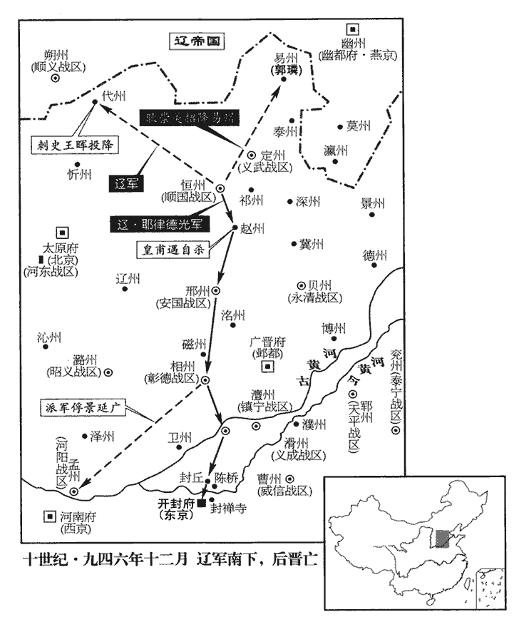 9乙丑‹二十四›,定州言契丹勒兵壓境。詔以天平‹总部郓州›節度使、侍衛馬步都指揮使李守貞為北面行營都部署,義成‹总部滑州›節度使皇甫遇副之;彰德‹总部相州›節度使張彥澤充馬軍都指揮使兼都虞候,義武節度使薊‹幽州州政府所在县·北京市›人李殷充步軍都指揮使兼都排陳使;薊,音計。陳,讀曰陣。遣護聖指揮使臨清‹河北省临西县›王彥超、太原‹山西省太原市›白延遇以部兵十營詣邢州‹河北省邢台市›。時馬軍都指揮使、鎮安‹总部设陈州河南省淮阳县›節度使李彥韜方用事,時以陳州置鎮安軍。視守貞蔑如也。守貞在外所為,事無大小,彥韜必知之,守貞外雖敬奉而內恨之。為李守貞與杜威降契丹張本。