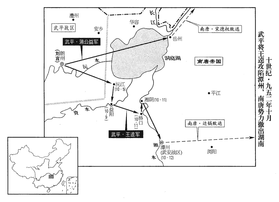 冬,十月,逵等將兵分道趣長沙,趣,七喻翻。以孫朗、曹進為先鋒使,孫朗、曹進奔朗州,見上卷是年正月。邊鎬遣指揮使郭再誠等將兵屯益陽‹湖南省益阳市›以拒之。戊子‹五›,逵等克沅江‹湖南省沅江市›,沅,音元。沅江,漢益陽縣地,隋改為安樂,又改為沅江,乾寧中改為橋江,楚復為沅江,屬朗州。九域志:在岳州西南一百二十六里。執都監劉承遇,裨將李師德帥眾五百降之。帥,讀曰率。降,戶江翻。壬辰‹九›,逵等命軍士舉小舟自蔽,直造益陽,造,七到翻。四面斧寨而入,遂克之,殺戍兵二千人。邊鎬告急於唐。甲午‹十一›,逵等克橋口‹湖南省望城县西北乔口镇›及湘陰‹湖南省湘阴县›。九域志:潭州長沙縣有橋口鎮。乙未‹十二›,至潭州‹湖南省长沙市›,邊鎬嬰城自守;救兵未至,城中兵少,丙申‹十三›夜,鎬棄城走,吏民俱潰。醴陵門橋折,醴陵門,潭州城東門。折,而設翻。死者萬餘人,道州‹湖南省道县›刺史廖偃為亂兵所殺。丁酉‹十四›旦,王逵入城,自稱武平節度副使、權知軍府事,「武平」‹总部朗州›當作「武安」‹总部潭州›。軍府,謂潭州軍府也。以何敬真為行軍司馬。遣敬真等追鎬,不及,斬首五百級。蒲公益攻岳州‹湖南省岳阳市›,風俗通:漢有詹事蒲昌。又晉書載記:氐酋蒲洪之先,其家池中蒲生,長五丈,如竹形,時咸謂之「蒲家」,因以為氏,其後改姓苻。則蒲之所自出有二焉。唐岳州刺史宋德權走,劉言以公益權知岳州。唐將守湖南諸州者,聞長沙陷,相繼遁去。劉言盡復馬氏嶺北故地,惟郴‹湖南省郴州市›、連‹广东省连州市›入于南漢‹首都兴王府›。郴,尹林翻。