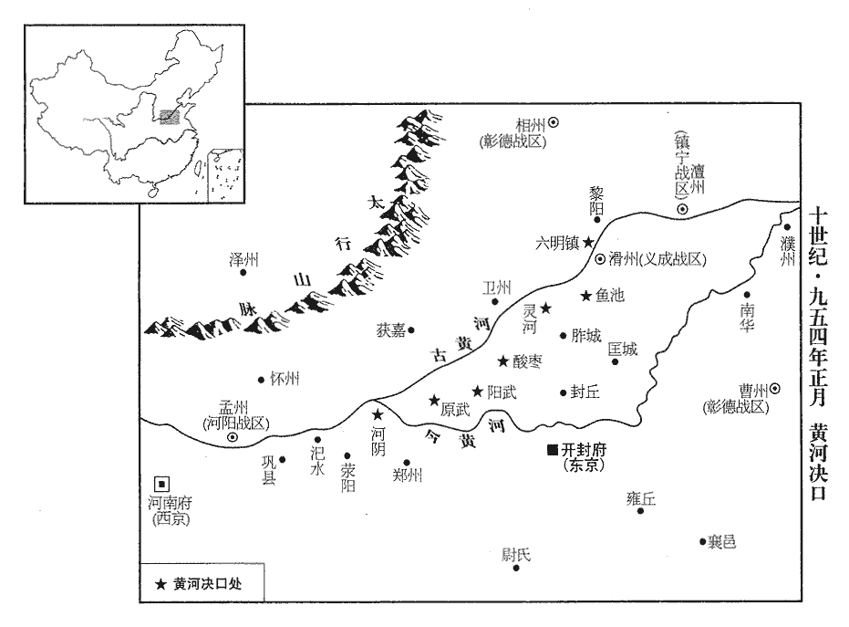 9庚寅‹十五›,詔前登州‹山东省蓬莱市›刺史周訓等塞決河。先是,河決靈河‹河南省卫辉市东›、魚池‹河南省浚县东南古黄河北岸›、酸棗‹河南省原阳县东北延州乡›、陽武‹河南省原阳县›、常樂驛、河陰‹河南省郑州市西北桃花峪›、六明鎮‹河南省浚县西南›、原武‹河南省原阳县西南原武镇›,凡八口。九域志:滑州白馬縣有靈河鎮。魚池亦在滑州界。酸棗津在大梁東北。陽武在鄭州。河陰在孟州東南。六明鎮在大通軍。大通軍即胡梁渡也,晉天福四年,建浮橋,置大通軍。原武在鄭州之北。塞,悉則翻。先,悉薦翻。至是,分遣使者塞之。