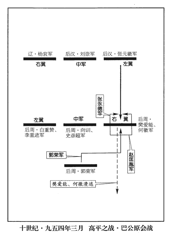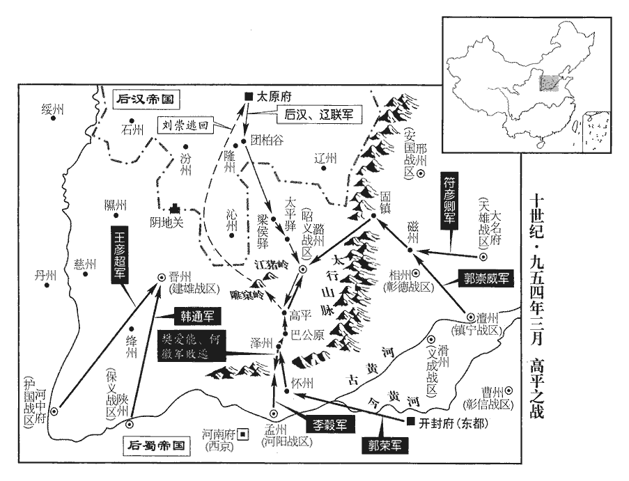 北漢主‹刘崇›不知帝‹郭荣›至,過潞州‹山西省长治市›不攻,引兵而南,是夕,軍於高平‹山西省高平县›之南。劉昫曰︰高平,漢泫氏縣地。宋白曰︰漢泫氏縣,後魏改玄氏,北齊改高平。九域志︰高平縣在澤州東北六十五里。癸巳‹十九›,前鋒與北漢軍遇,擊之,考異曰:世宗實錄:「甲午,賊陳於高平南之高原。」按下又有甲午,此必癸巳誤也。今從十國紀年。北漢兵卻;帝慮其遁去,趣諸軍亟進。趣,讀曰促。北漢主以中軍陳於巴公原‹山西省晋城市东北›,陳,讀曰陣;下同。巴公鎮在晉城縣東北。張元徽軍其東,楊袞軍其西,眾頗嚴整。時河陽‹总部孟州›節度使劉詞將後軍未至,眾心危懼,而帝志氣益銳,命白重進與侍衛馬步都虞候李重進將左軍居西,白重進」,當作「白重贊」。【章:十二行本正作「贊」;乙十一行本同;孔本同;張校同;退齋校同。】樊愛能、何徽將右軍居東,向訓、史彥超將精騎居中央,殿前都指揮使張永德將禁兵衛帝。帝介馬自臨陳督戰。
