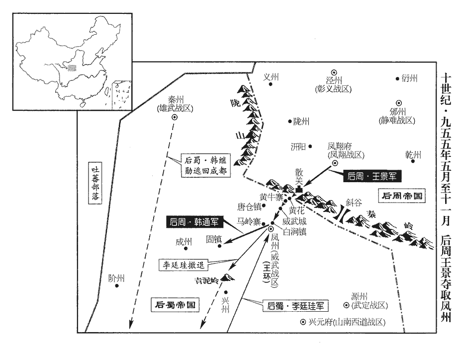 11帝‹郭荣›常憤廣明以來中國日蹙,唐僖宗廣明元年,黃巢入長安,自此之後,強藩割據,中國日蹙矣。及高平‹山西省高平县›既捷,慨然有削平天下之志。會秦州‹甘肃省秦安县西北›民夷有詣大梁‹后周首都开封府所在城·河南省开封市›獻策請恢復舊疆者,以唐全盛版圖言之,蜀亦舊疆也。以漢、晉事言之,則契丹入中原,重以王景崇之亂,階‹甘肃省武都县东›、成‹甘肃省成县›、秦‹甘肃省秦安县西北›、鳳‹陕西省凤县›遂入於蜀。帝納其言。為取階、成、秦、鳳張本。